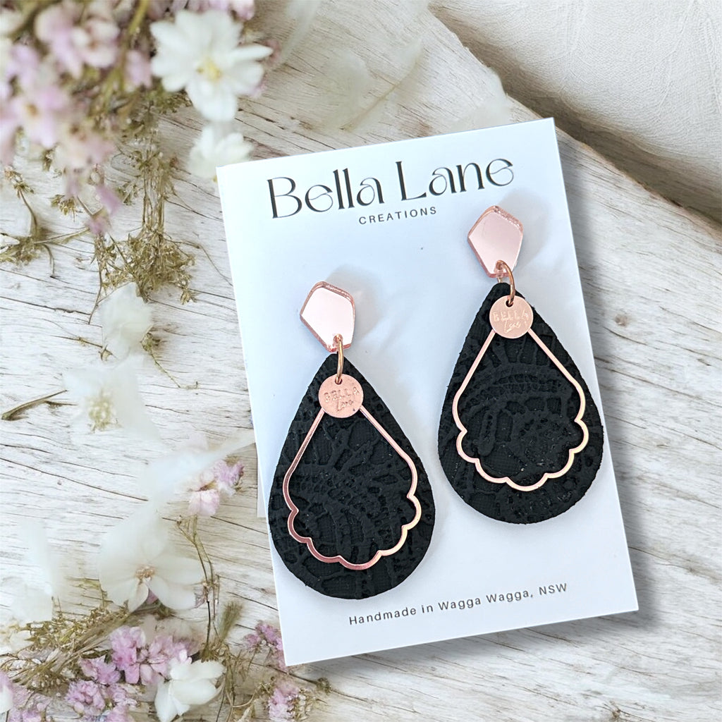 Timeless with a modern edge, our Black Lace Scalloped Teardrop Earrings feature a richly textured lace-inspired finish paired with a soft scalloped teardrop shape. Finished with rose-gold accents and a sleek geometric stud top, these earrings strike the perfect balance between classic and contemporary.
