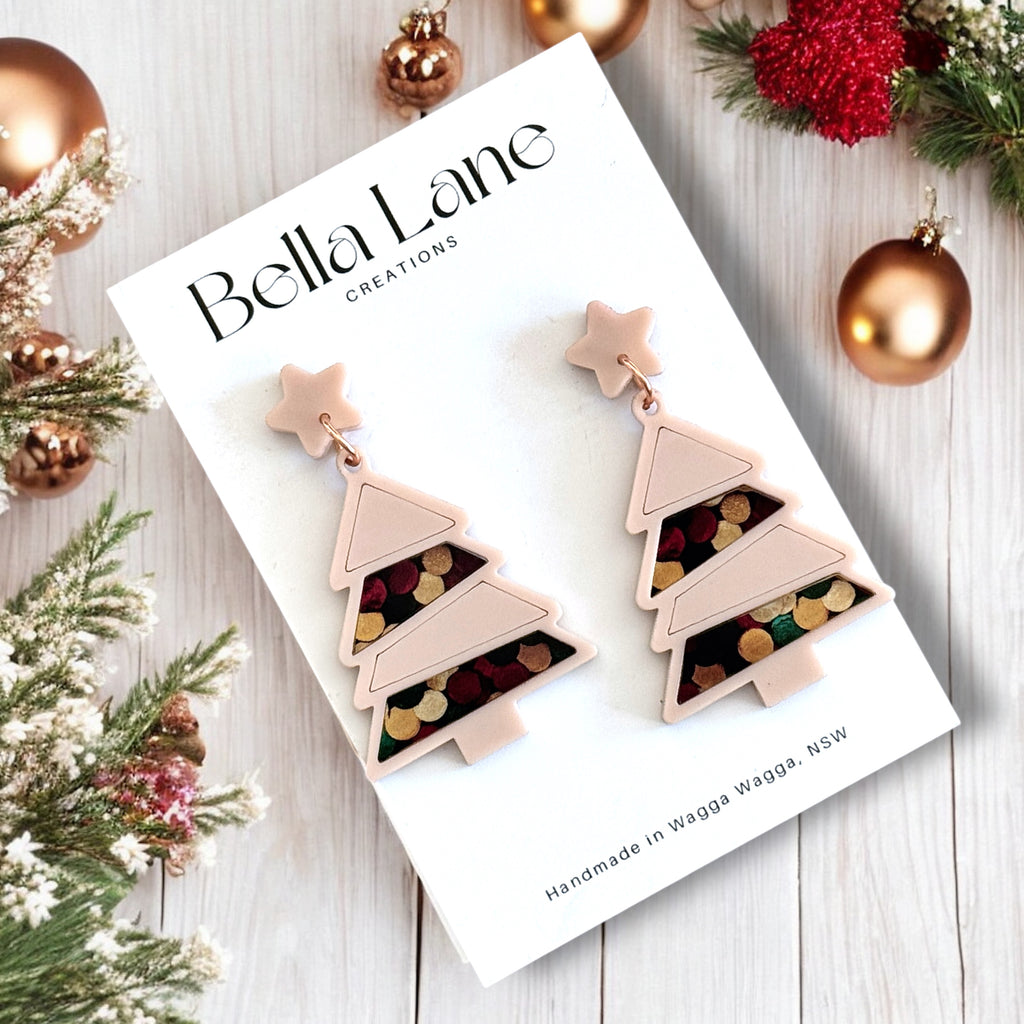 Christmas Confetti Earrings with a beige base 🎄✨ These statement earrings are the perfect way to add a pop of festive fun to any outfit. Eye-catching yet lightweight and comfortable – you’ll forget you’re even wearing them until the compliments start rolling in!