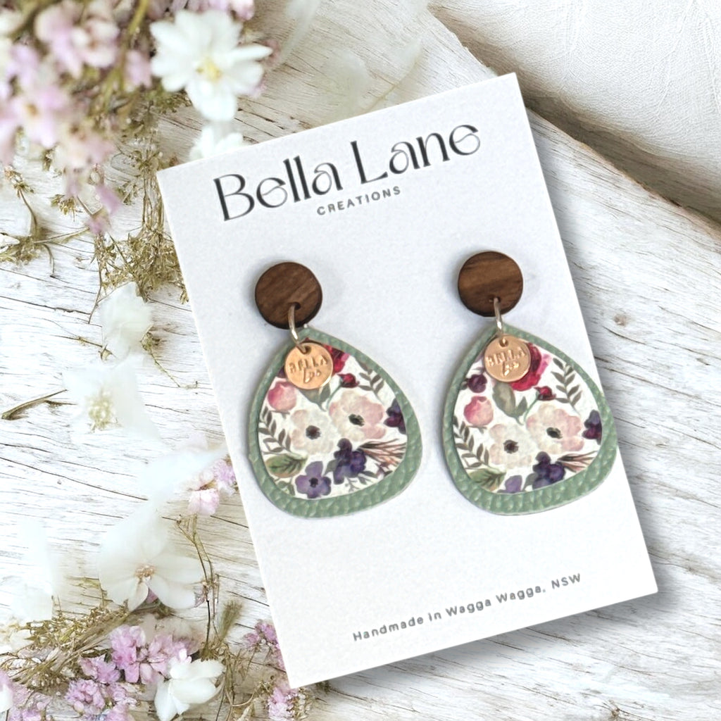 Soft, romantic and effortlessly wearable, the Willow Bloom Drops are a beautiful blend of nature-inspired textures and vintage florals. Featuring a delicate floral print layered over a muted sage base and finished with a natural timber stud, these earrings are lightweight, comfortable and designed for all-day wear.